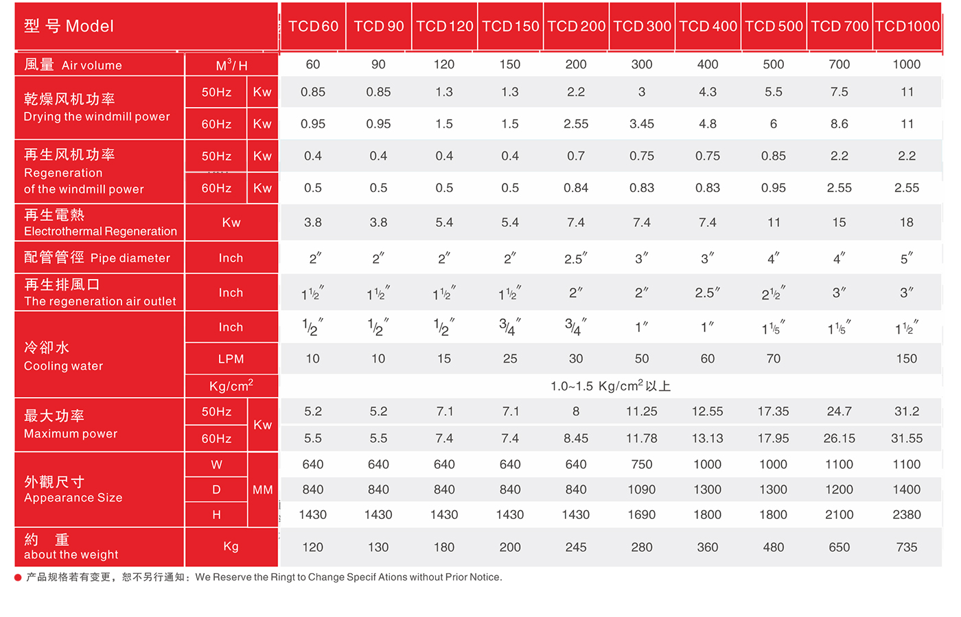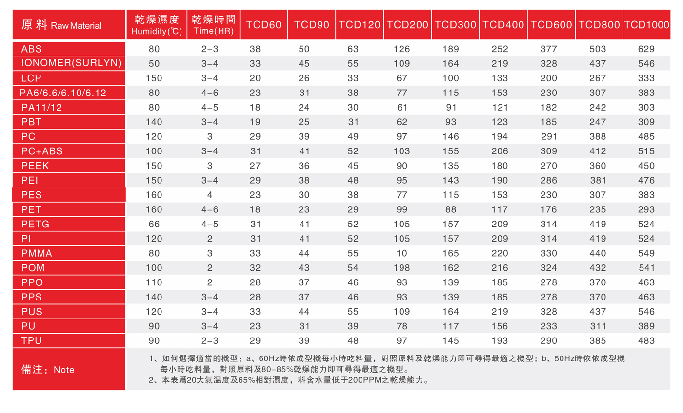 TCD蜂巢式除湿干燥机系列 主要与热风式乾燥机搭配,专门对吸湿性较强的工程塑料(如:Nylon,PC,PBT,PET等)进行高效率的除湿乾燥作业,该系列采用高效能转轮,在搭配冷冻水情况下,能确保-40℃露点的稳定除湿效果。乾燥风量60~10...
