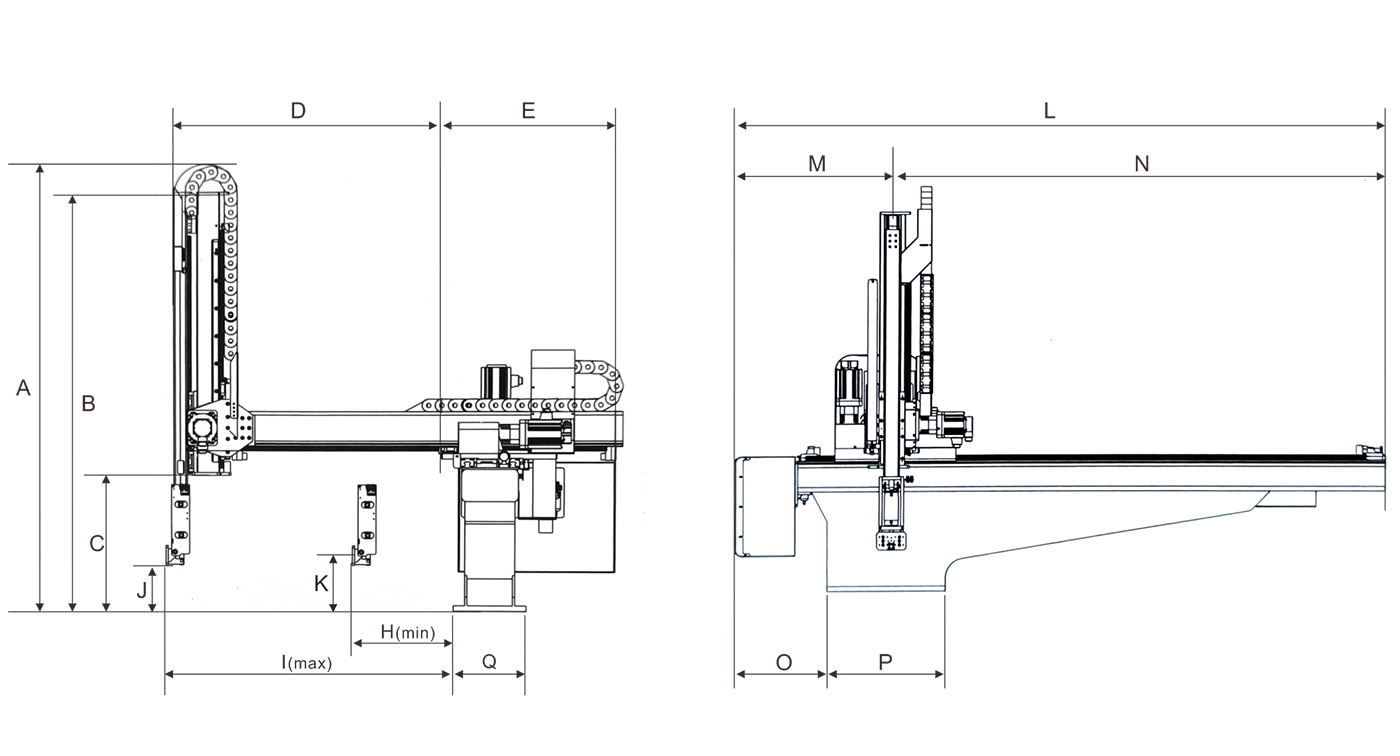 TYS中型橫走式系列為開放式(牛頭式)機械手,標配為雙截開放式,三軸伺服驅動。伺服驅動優點調試方便,運行速度快,動作平穩,使用壽命長。雙截式優點;減低機械手的整機高度,動作穩定性好,手臂上下速度快。引拔開放式;主要適用拿取長條型、面積大的塑膠產品(如汽車保險杠,地臺板等)