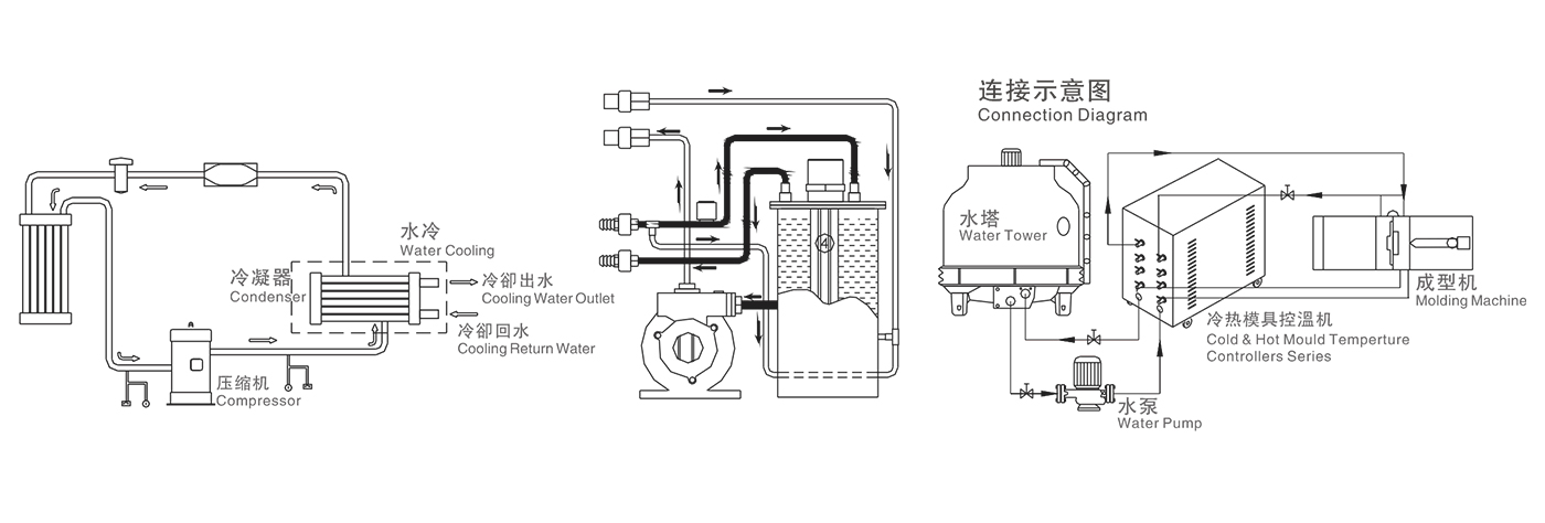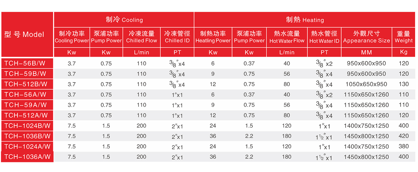 TCH冷热一体机模具温控机系列 本机具有制冷和加热双重功能,能满足任何产品对模具的要求;本机型适用于双温输出,或者模具加热一段时间后切换到冷却亦或冷却一段 时间后切换到加热的单温输出模式